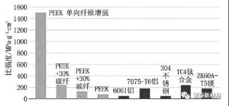 PEEK材料與其他常用航空金屬的比強度對比示意圖如圖二所示,由圖二可以看出,經(jīng)過短纖維增強的PEEK材料具有更優(yōu)異的強度和剛度。