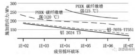 圖三、PEEK材料和鋁的拉伸疲勞性能對比示意圖