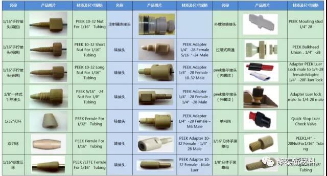 典型產(chǎn)品形式有:PEEK手緊接頭、PEEK螺絲、PEEK刃環(huán)、PEEK毛細(xì)管、PEEK二通三通、PEEK內(nèi)外絲轉(zhuǎn)接頭、PEEK送樣針、PEEK消解罐、PEEK軸套、PEEK密封圈、PEEK接插件等。圖二為高效液相色譜儀中各部位零件。
