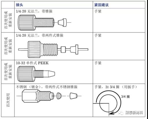 下圖(圖三)為高效液相色譜儀的工作流程。各部位工作時(shí)使用PEEK手緊接頭、PEEK螺絲、PEEK刃環(huán)、PEEK毛細(xì)管、PEEK二通三通等零部件連接。圖四為各規(guī)格形狀的聚醚醚酮接頭。圖五為各種聚醚醚酮接頭的使用建議。圖六為PEEK閥頭示意圖及閥頭實(shí)物圖。圖七為PEEK定量環(huán)示意圖及PEEK定量環(huán)實(shí)物圖。
