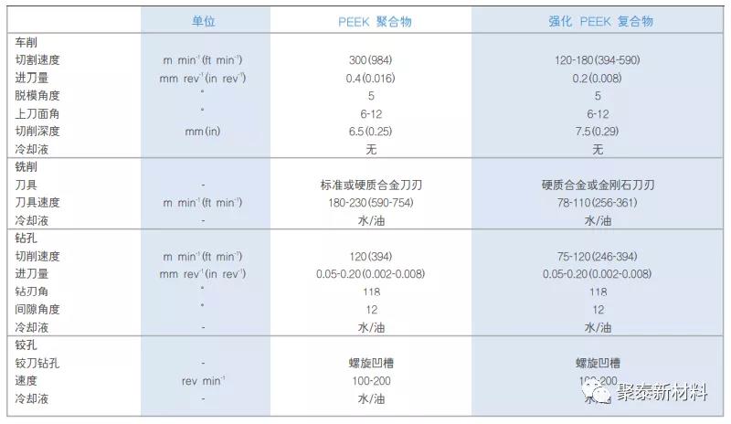 所有聚合物材料的導熱性都低于金屬的導熱性,所以會在機械加工中迅速累積熱量,應使用冷卻液消除加工材料中所產生的熱量,一般建議使用冷卻水來冷卻所有的PEEK聚合物制品,下表所示為建議的機械加工條件概述: