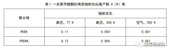 高分子材料輻照后將會產(chǎn)生自由基,輻射誘導(dǎo)的高分子反應(yīng)包括氧化、裂解、交聯(lián)和接枝都源于自由基的產(chǎn)生,對自由基的研究屬于微觀范疇,自由基的初級反應(yīng)和次級反應(yīng)導(dǎo)致的結(jié)果多種多樣,宏觀表現(xiàn)為材料物理化學(xué)性能的改變。因此,研究自由基的產(chǎn)生和演變是研究高分子材料輻照效應(yīng)的重要組成部分。輻射化學(xué)產(chǎn)額(G)是指1g材料每吸收100eV的能量所產(chǎn)生的斷裂自由基數(shù)、離子數(shù)、分子數(shù)等。輻射自由基產(chǎn)額可以反映材料的耐輻照性,輻射自由基產(chǎn)額越小,耐輻照性越強[1]。表1是一些典型的聚芳醚酮高分子材料的輻射自由基產(chǎn)額表。可以發(fā)現(xiàn)真空條件下輻照樣品的自由基產(chǎn)額大于空氣條件下輻照的樣品,同時,真空、77 K 條件下輻照樣品的自由基產(chǎn)額大于真空、300K條件下輻照的樣品。表明真空條件下隨著輻照溫度升高,自由基產(chǎn)額降低;相同輻照溫度條件下隨著氧氣含量增加,自由基產(chǎn)額降低。