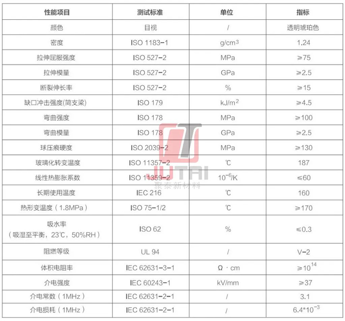 JUTAIPSU?NA是一款聚砜(PSU)型材。PSU為無定形的聚合物,玻璃化轉(zhuǎn)變溫度為187℃,PSU是一款透明的工程塑料,具有良好的耐化學性、剛性和耐溫性。由于聚合物中具有共軛的苯環(huán)和砜基團,PSU型材表現(xiàn)出較高的耐酸及鹽溶液腐蝕性能,并對于洗滌劑、熱水和蒸汽具有良好的耐受性。另外,PSU具有出眾的抗輻射性,且離子雜質(zhì)水平低。