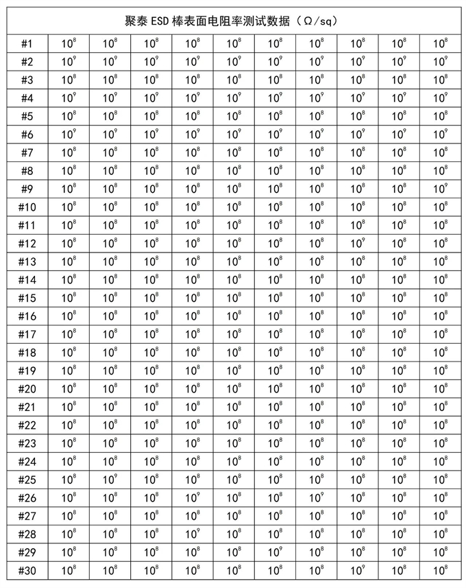 采用IEC 61340-2-3標準中的兩點電極法,測試電壓100V,電化時間取連續(xù) 5 次測量達到穩(wěn)態(tài)時間的平均值。隨機挑選30pcs不同批次的抗靜電PEEK型材進行表面電阻率測試,測試結果均集中在108-109Ω/sq,表明聚泰抗靜電PEEK型材的表面電阻率更集中更穩(wěn)定,批次間穩(wěn)定性好,抗靜電效果更突出。