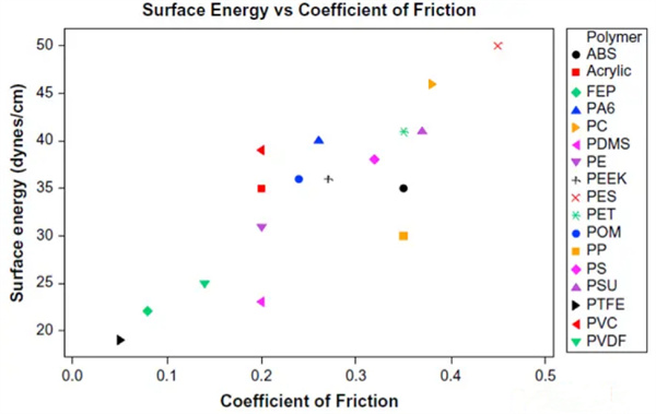 工程塑料表面能與摩擦系數(shù)的關(guān)系比對(duì)圖
